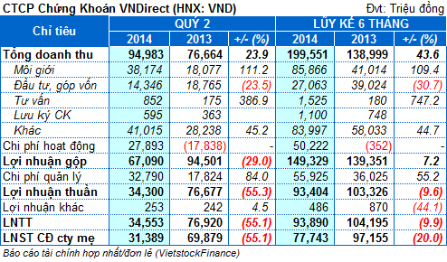 CTCP Chứng khoán VNDIRECT (HNX: VND) công bố BCTC quý 2/2014 với doanh thu tăng 24% nhưng lãi ròng chỉ bằng một nửa so với cùng kỳ năm trước.