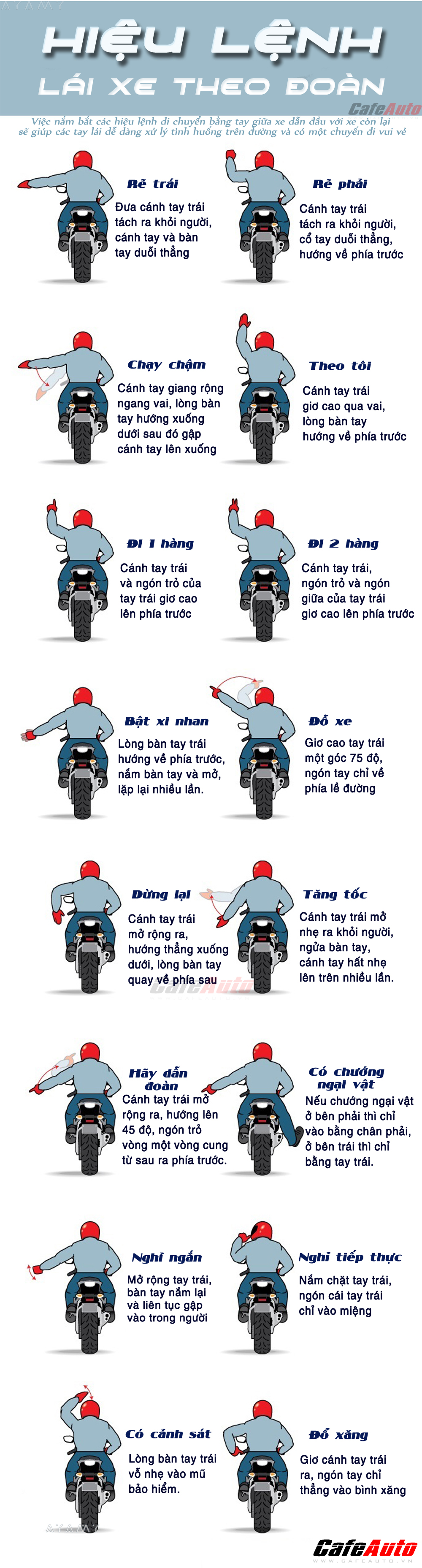 Việc nắm bắt các hiệu lệnh di chuyển bằng tay giữa xe dẫn đầu với những xe còn lại hoặc giữa các xe với nhau sẽ giúp đảm bảo tính kỷ luật và an toàn cho đoàn, cũng như giúp các tay lái tận hưởng chuyến hành trình trọn vẹn.
